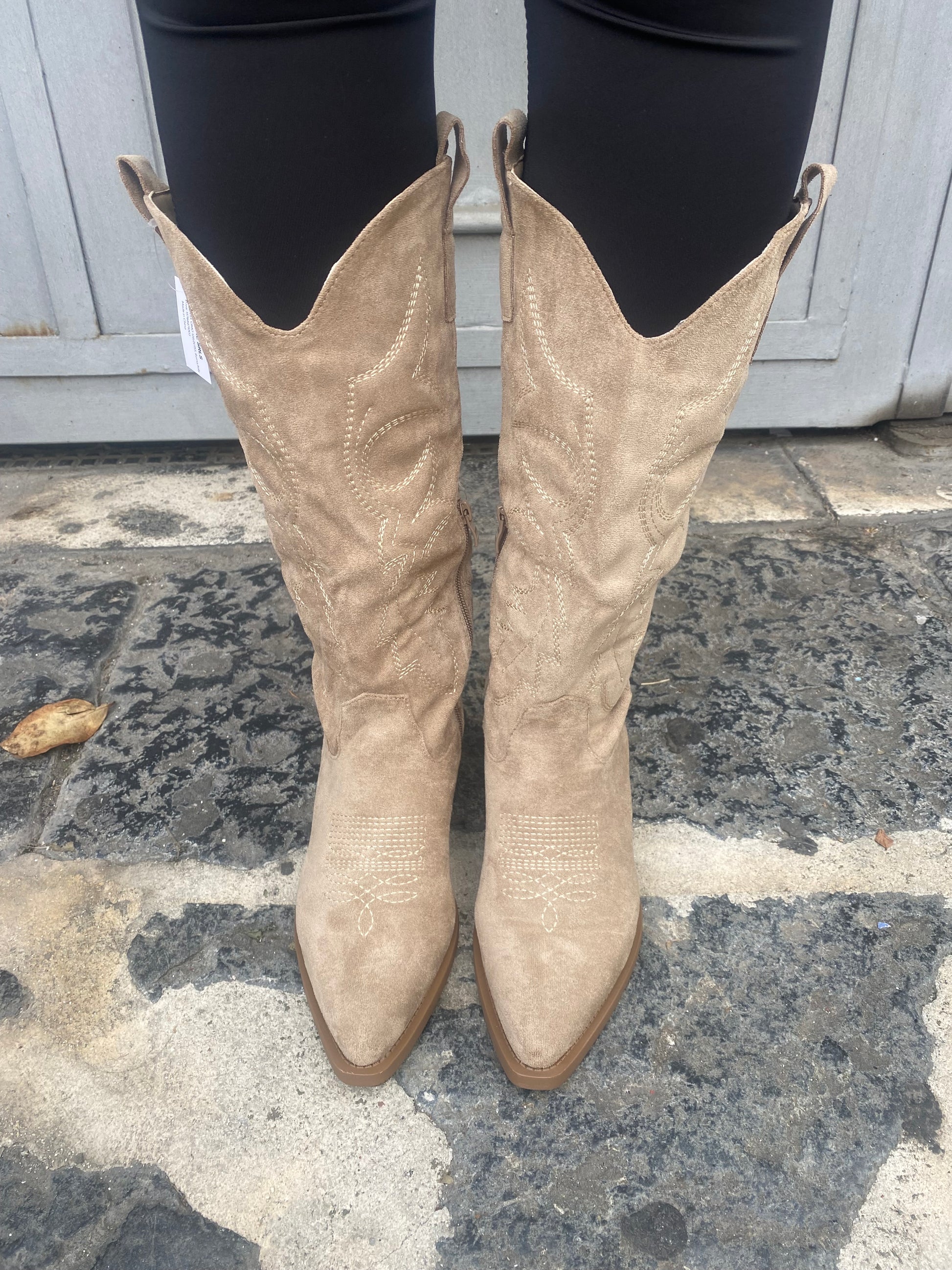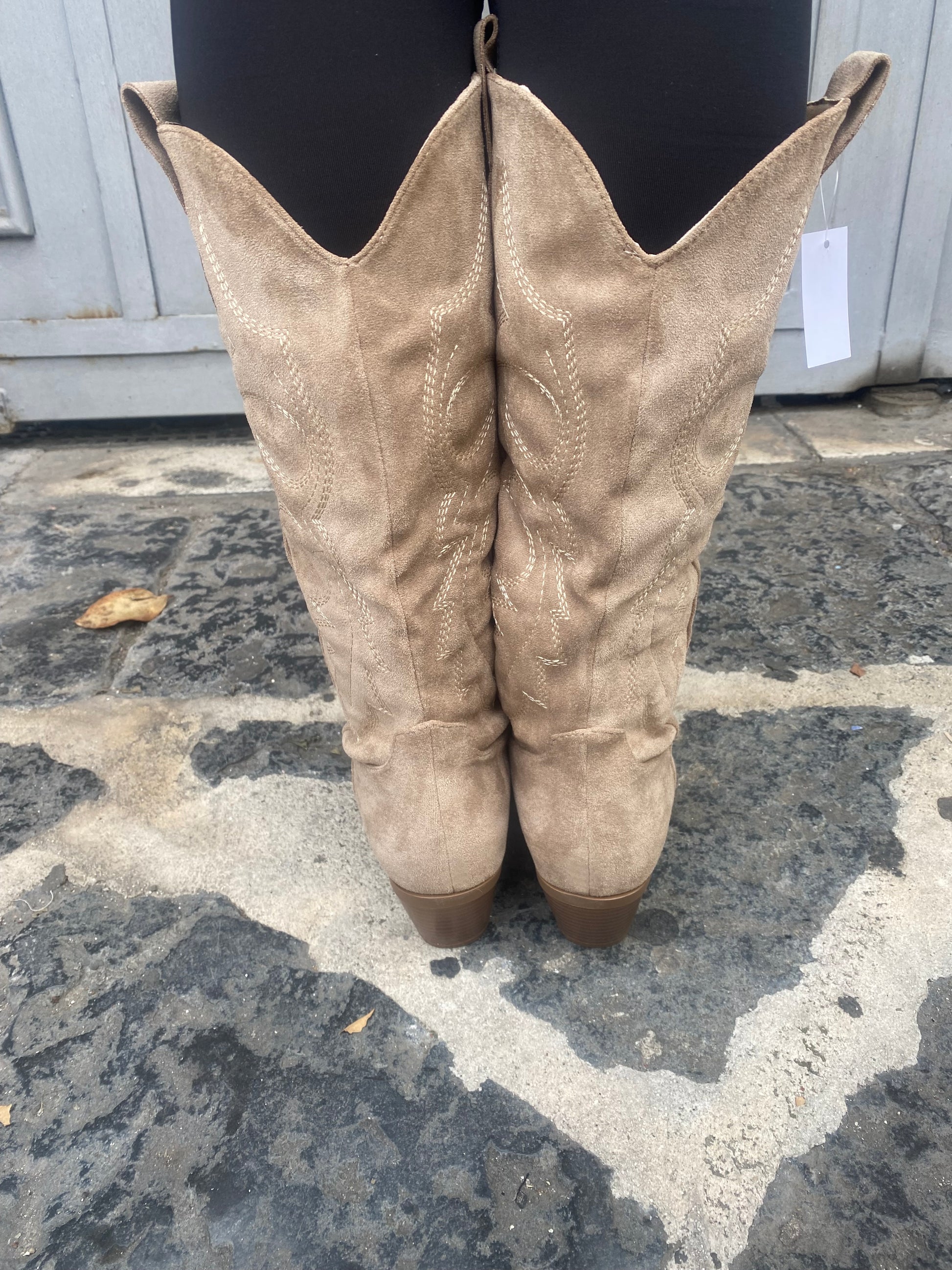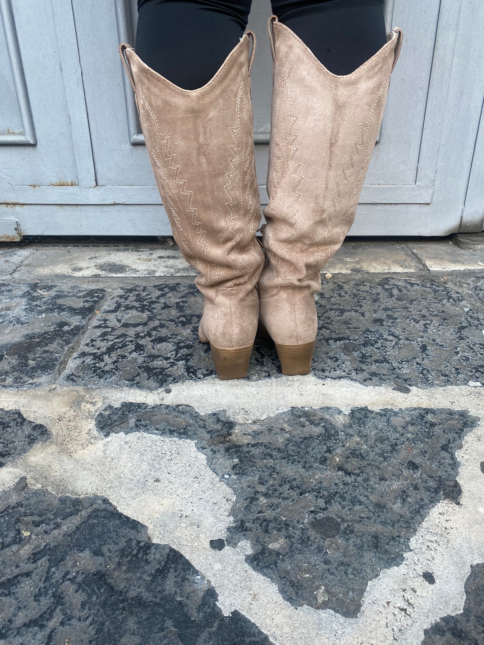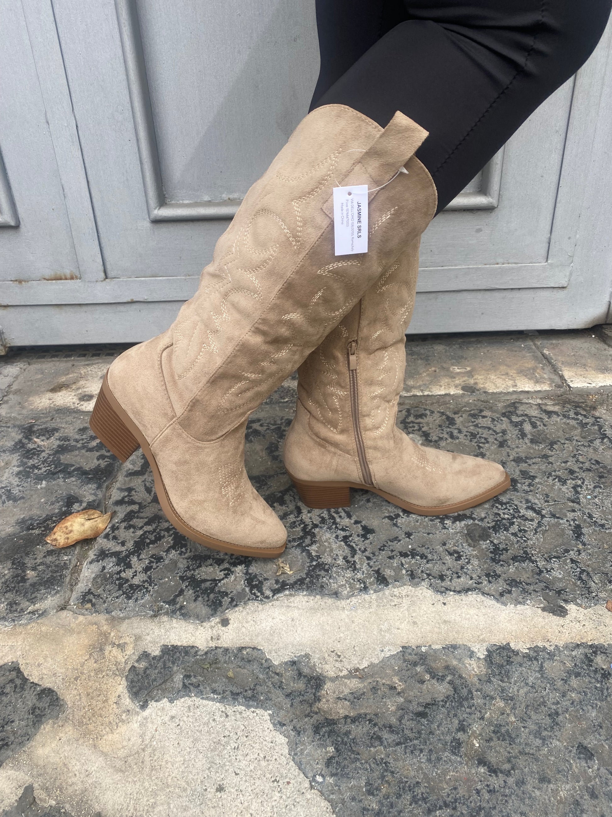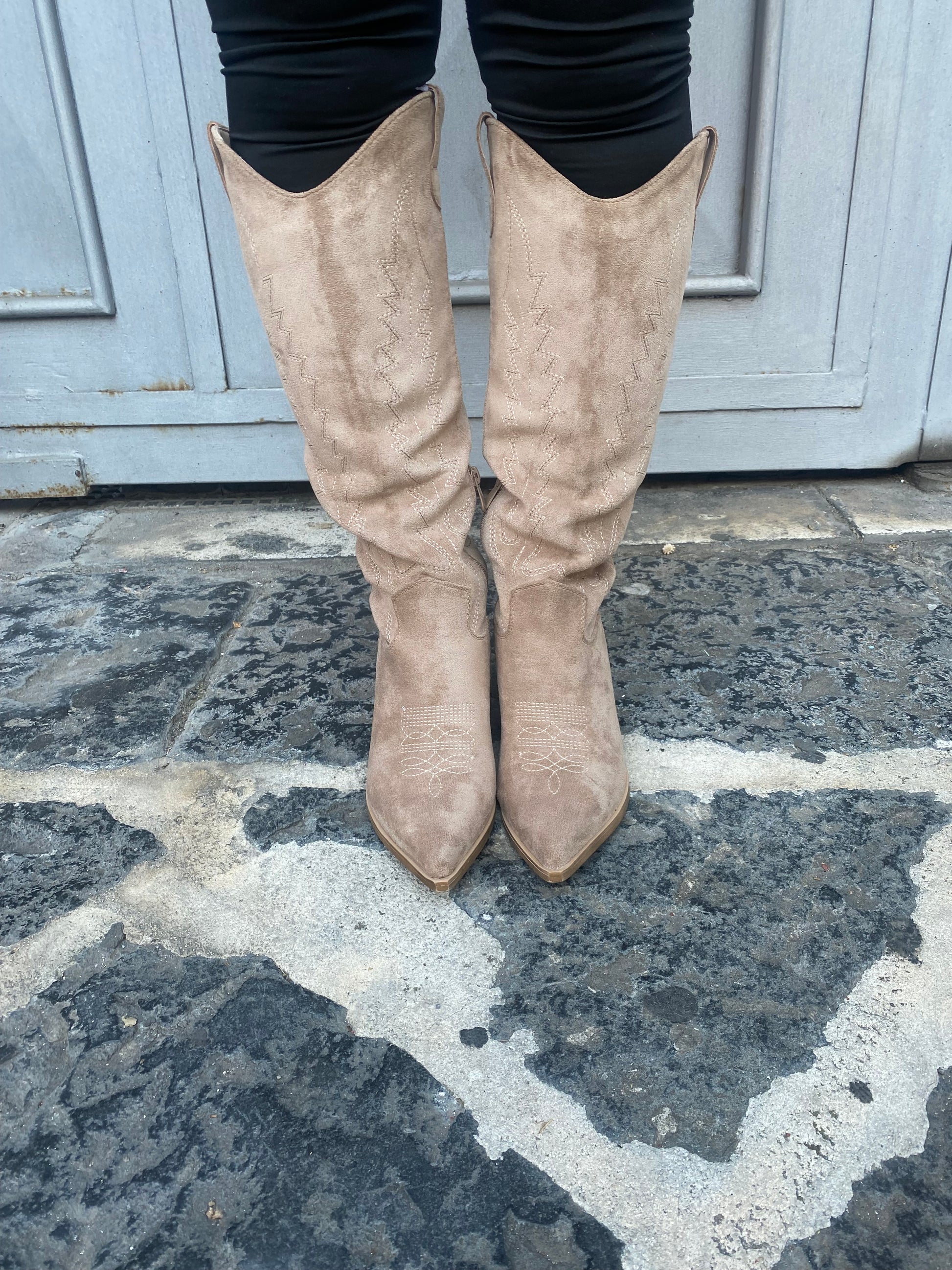 Camperos in camoscio alto fino al ginocchio con tacco quadrato basso e decorazioni