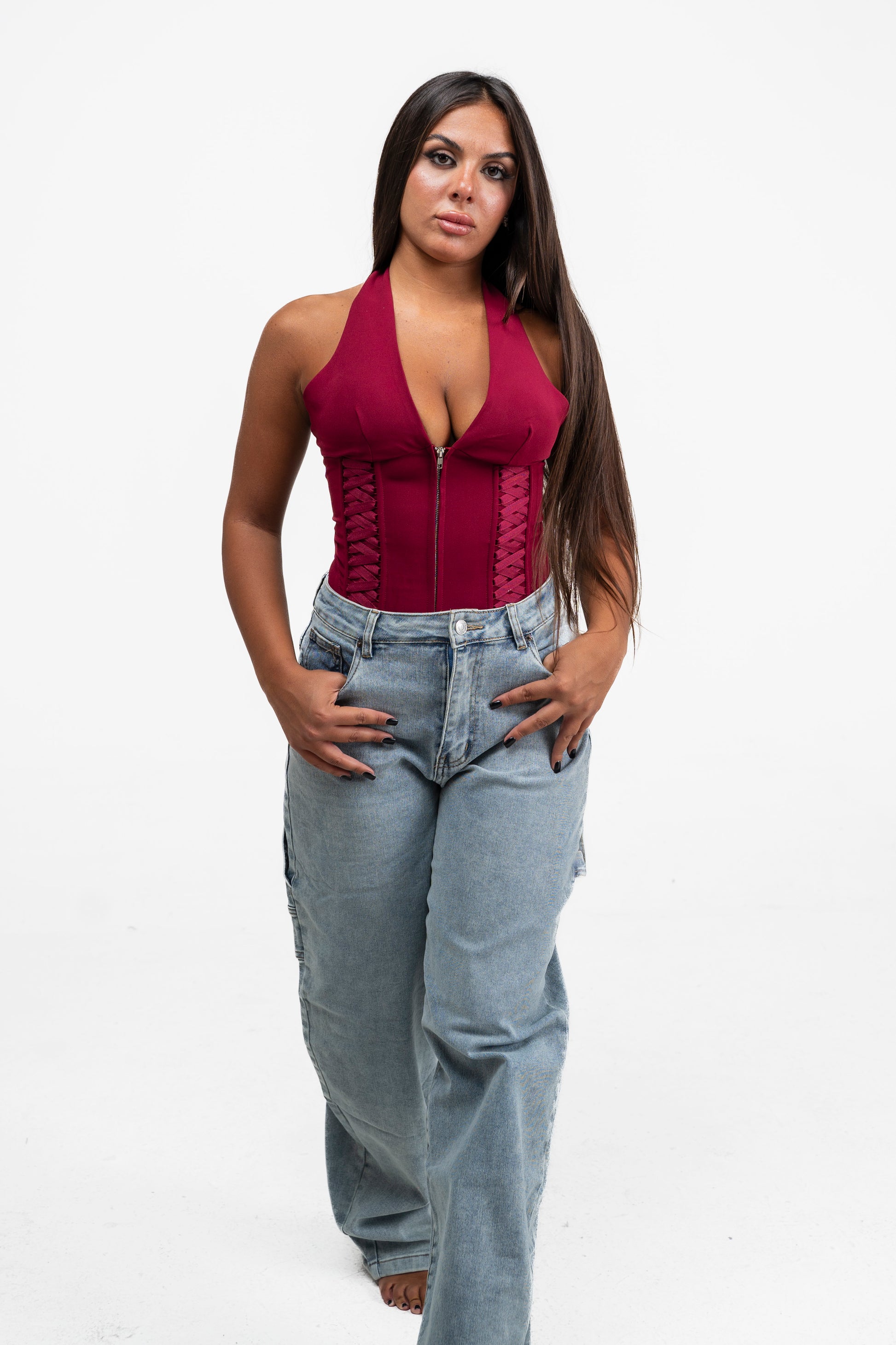 Corsetto con zip sul davanti e con chiusura a nastro sulla schiena