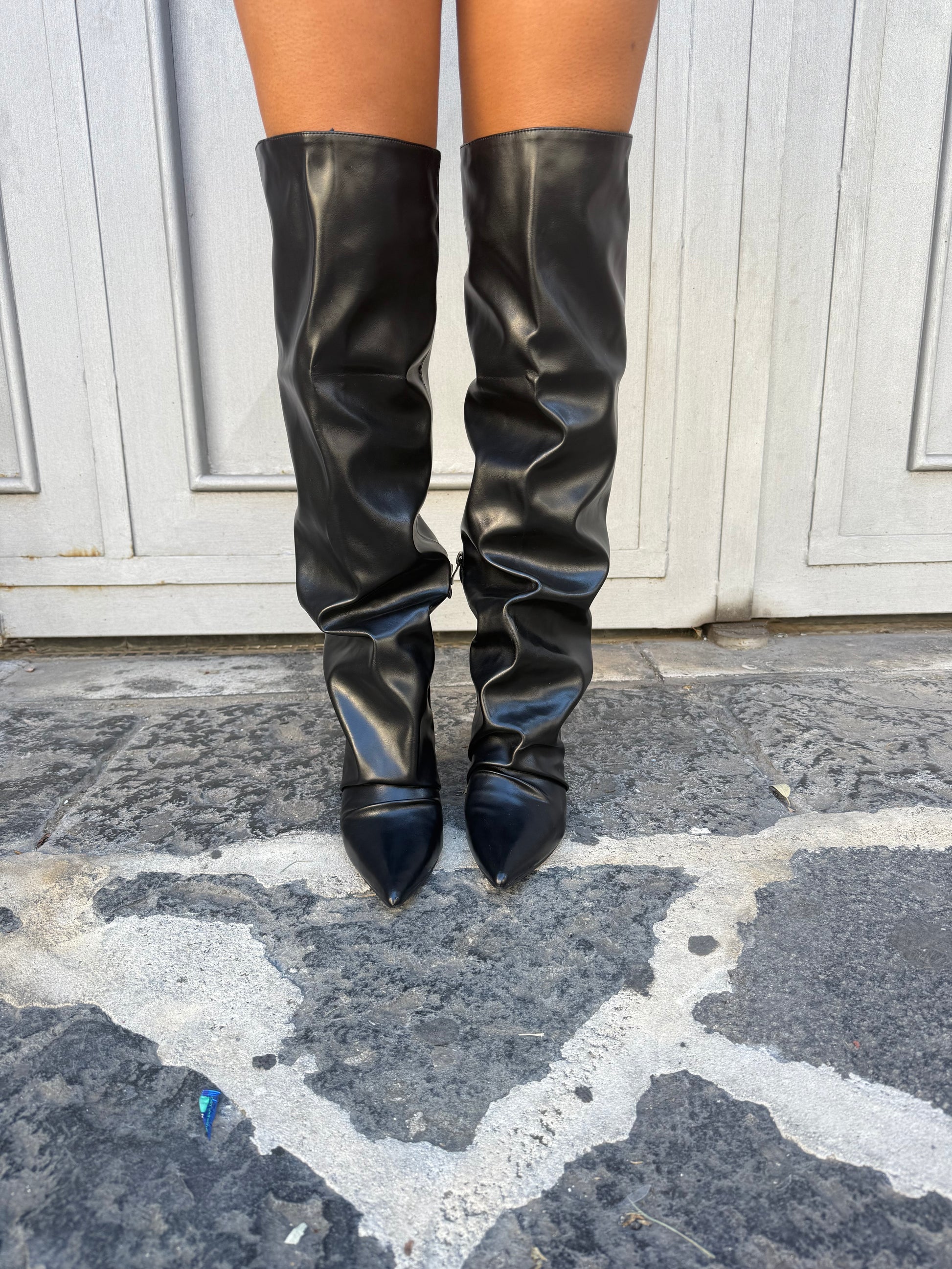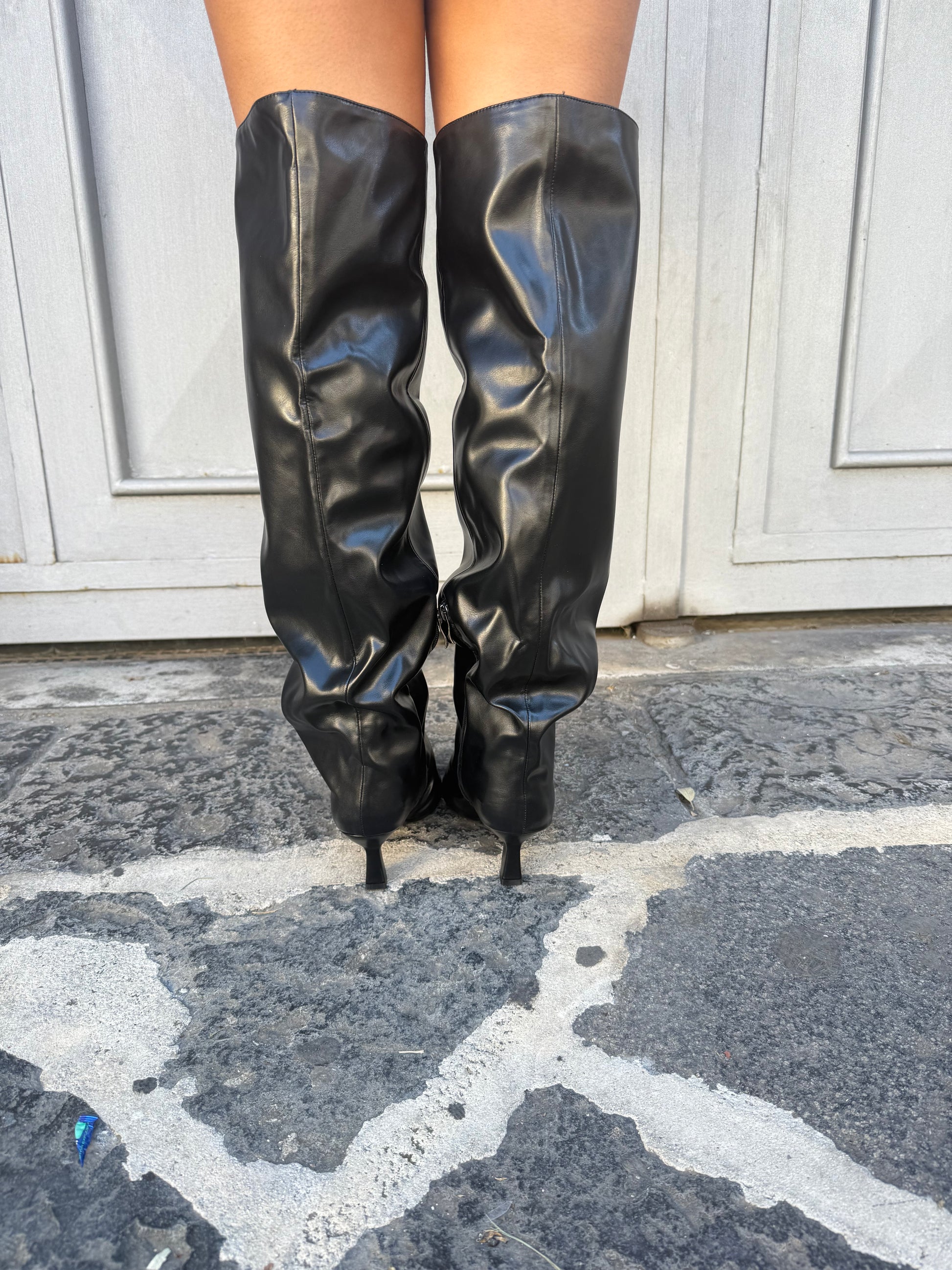 Stivale in pelle nero alto al di sopra del ginocchio con tacco basso.