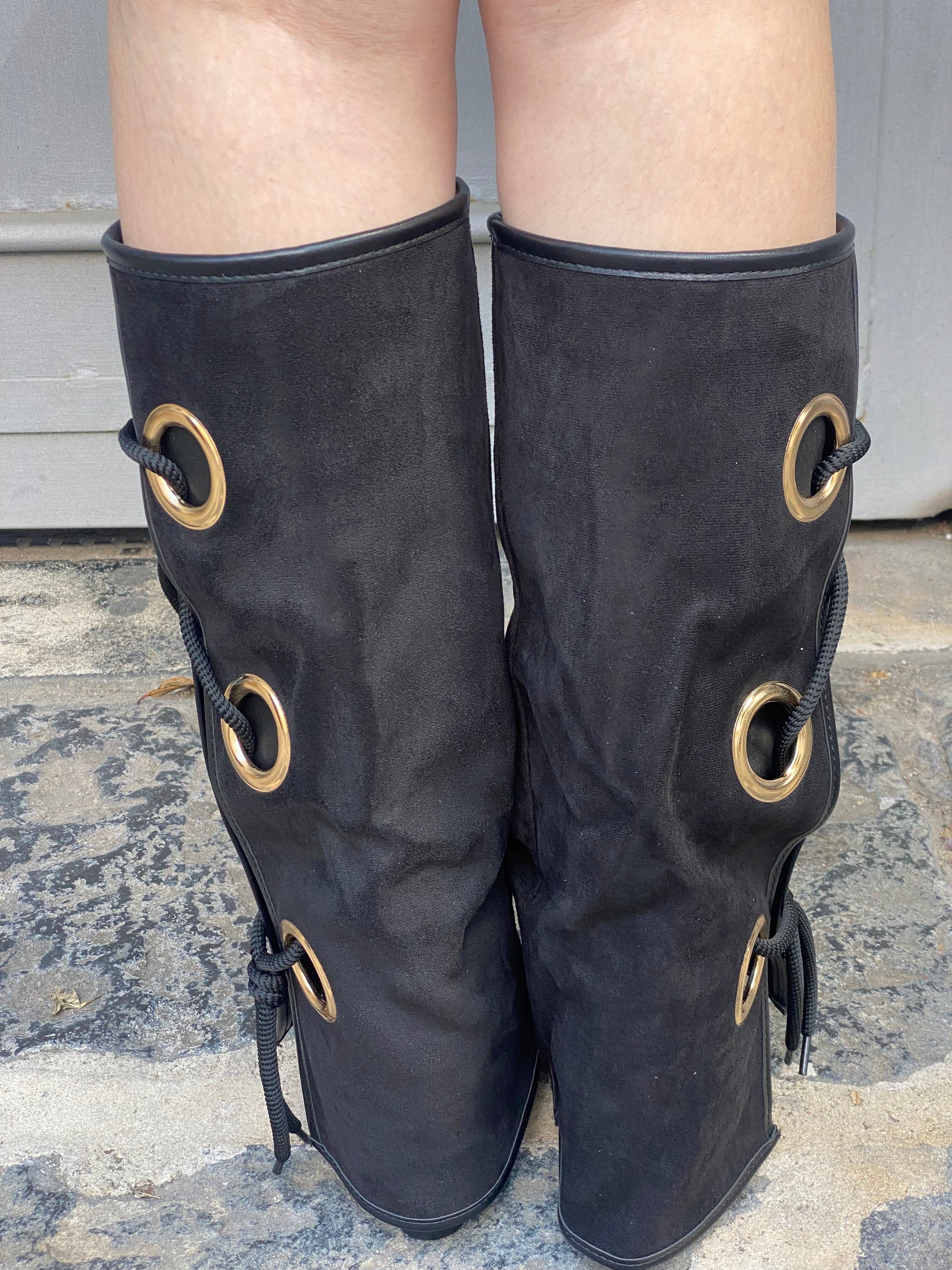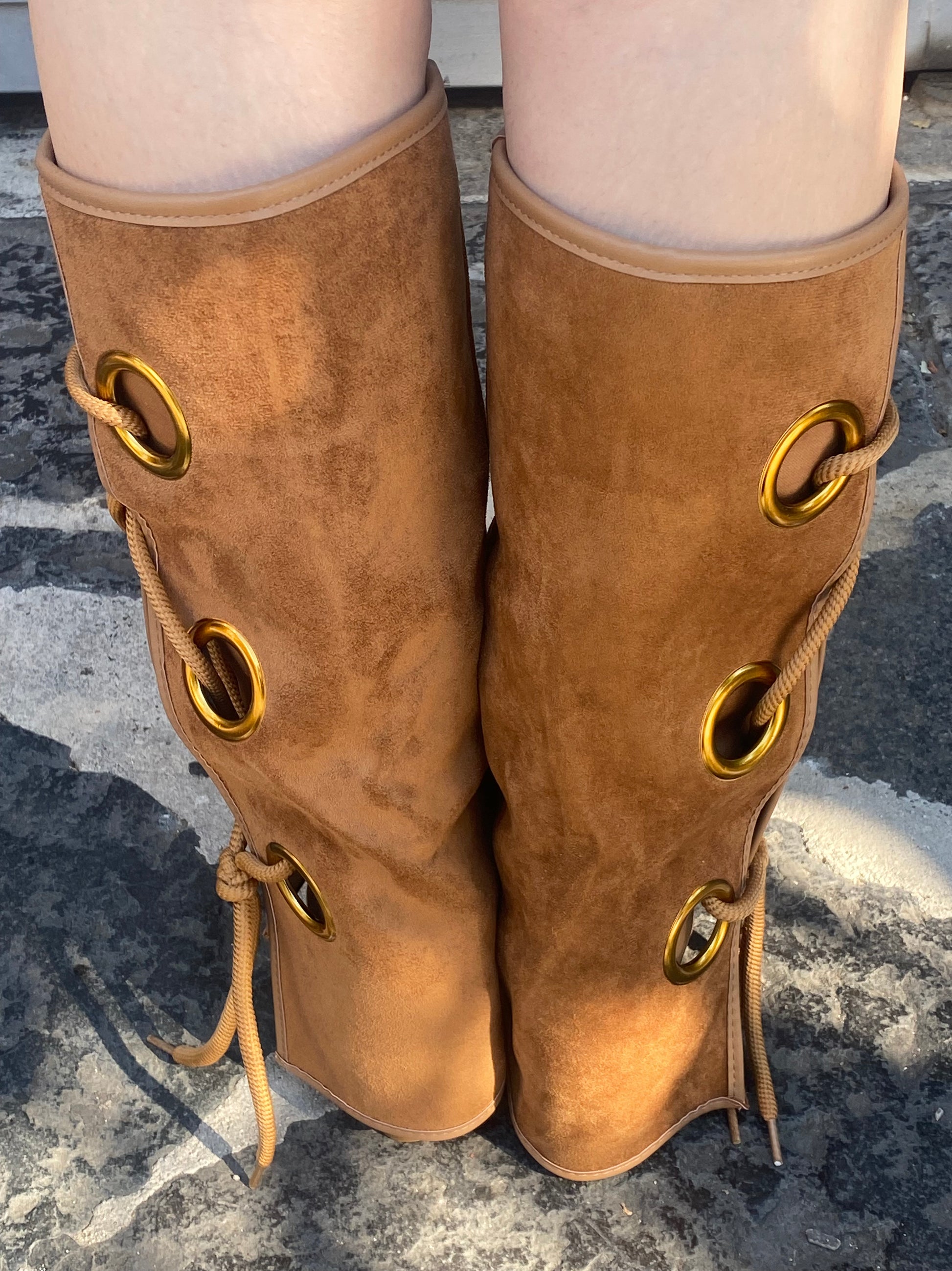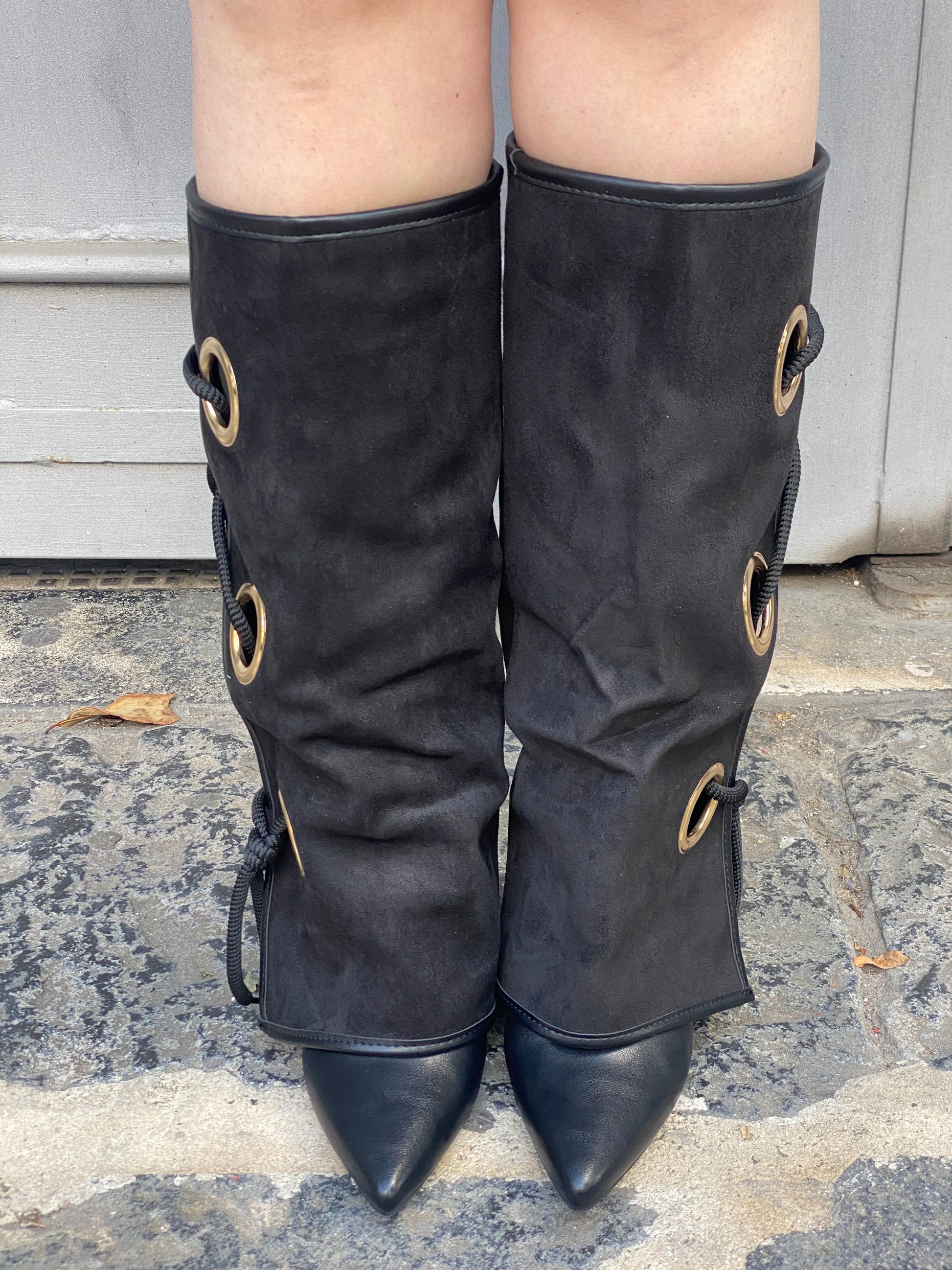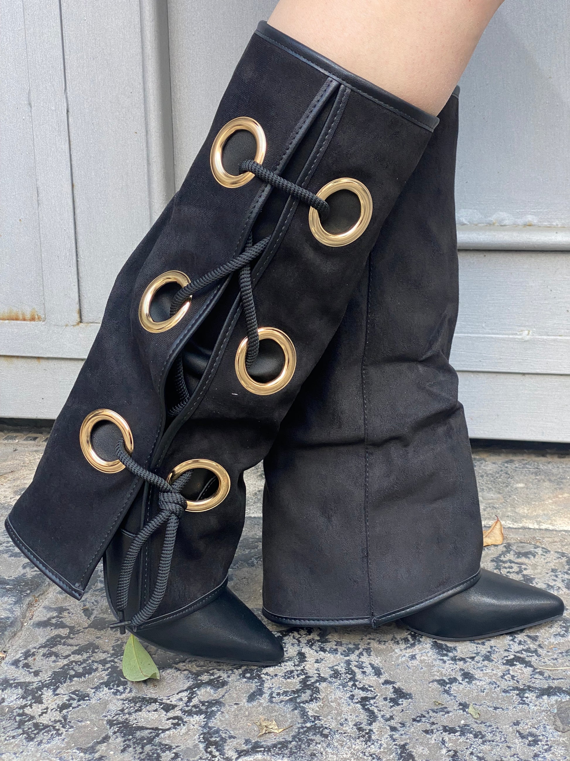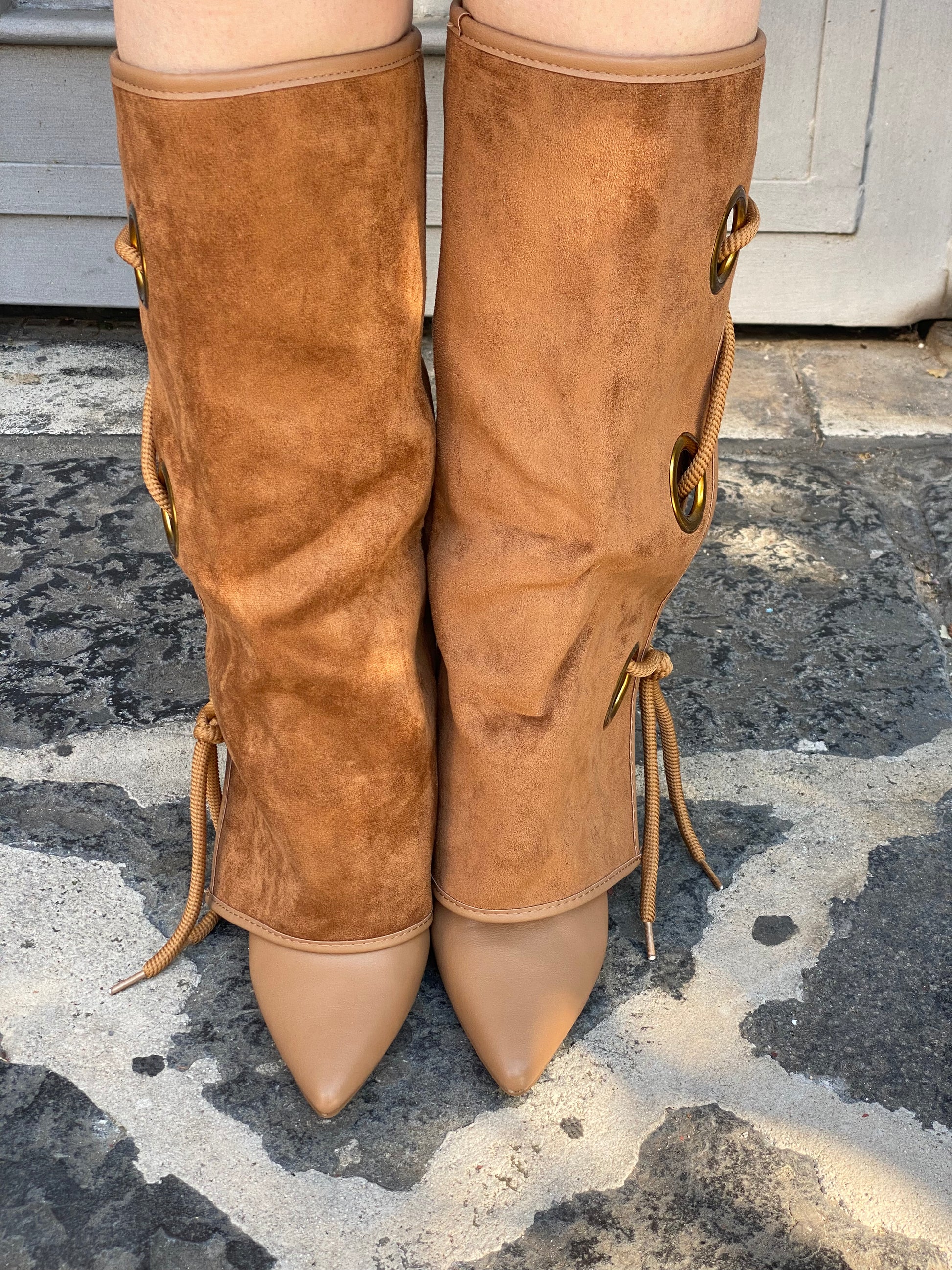Stivale in camoscio con tacco quadrato alto e mezza zip all’interno.