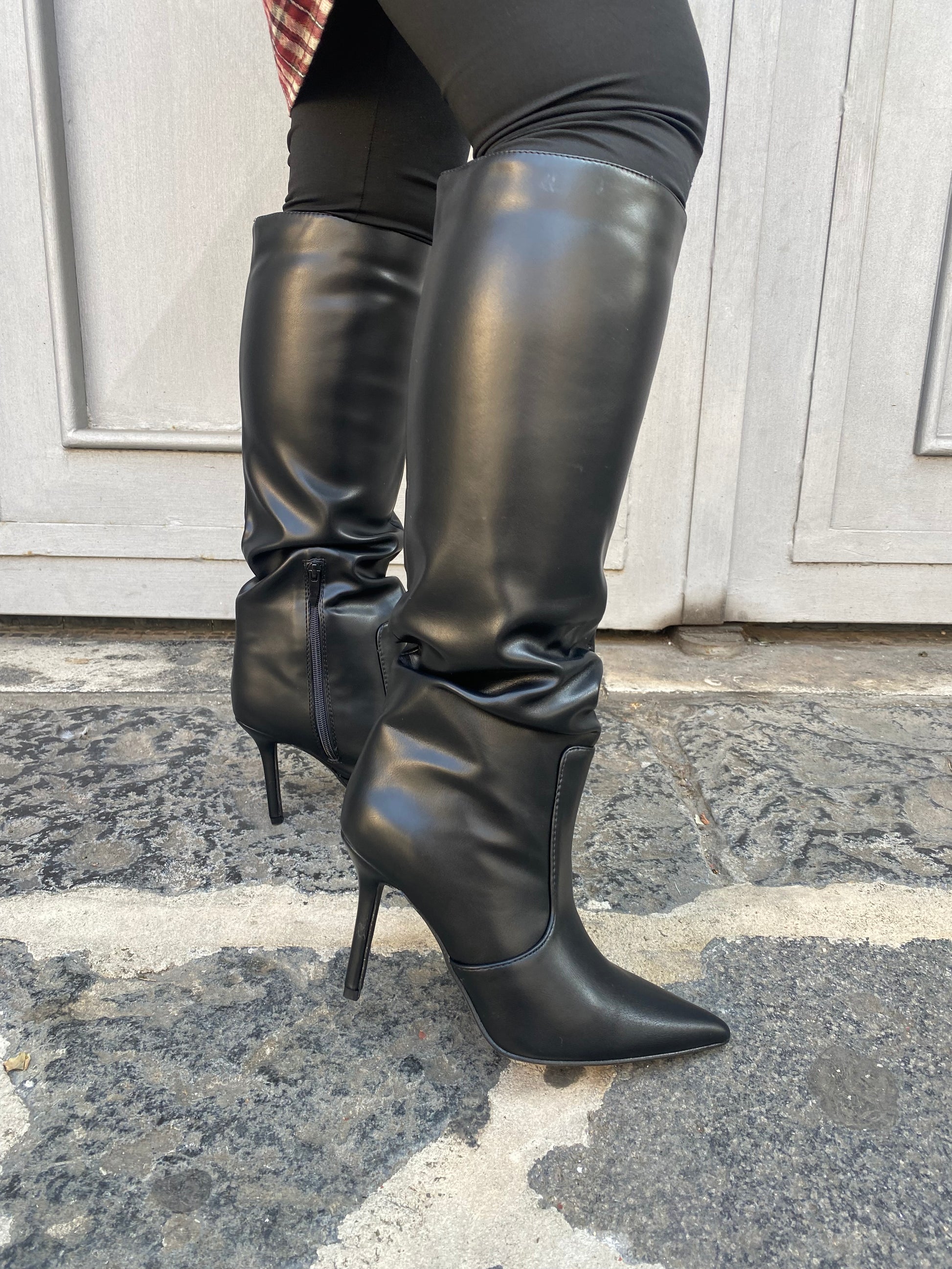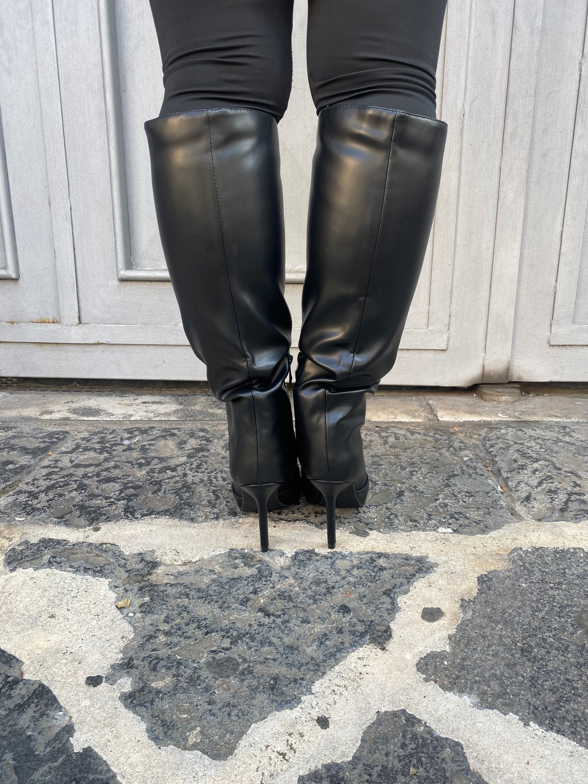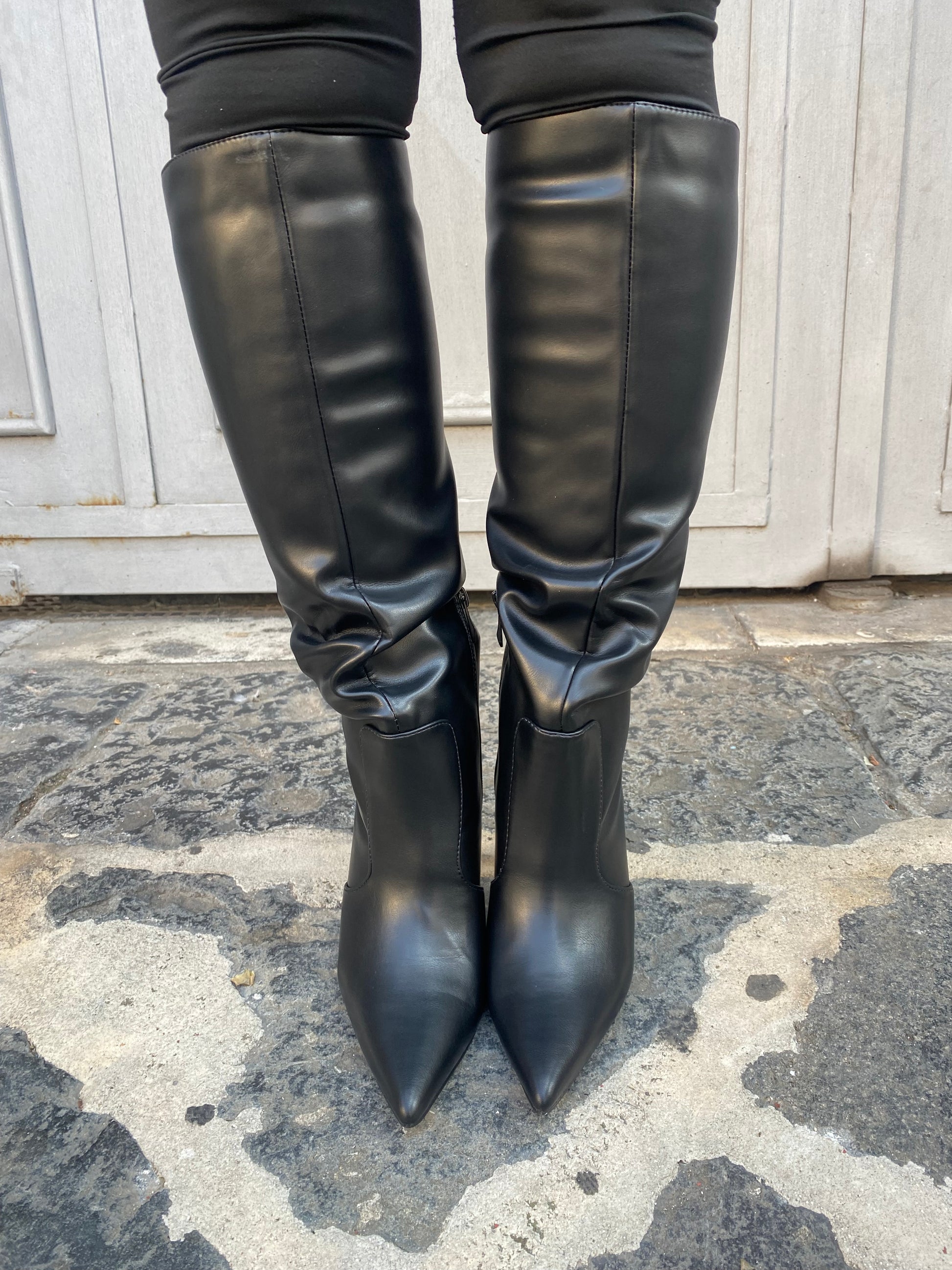 stivale in pelle alto al ginocchio e aderente alla gamba. Ha il tacco a spillo